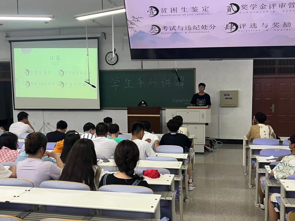 为了让2023级新生尽快了解学校规章制度,加强学风考风建设,帮助同学们顺利适应大学新生活,2023年9月8日,独播库 学生工作部开展了新生入学教育——学生手册讲堂。