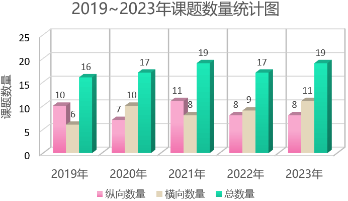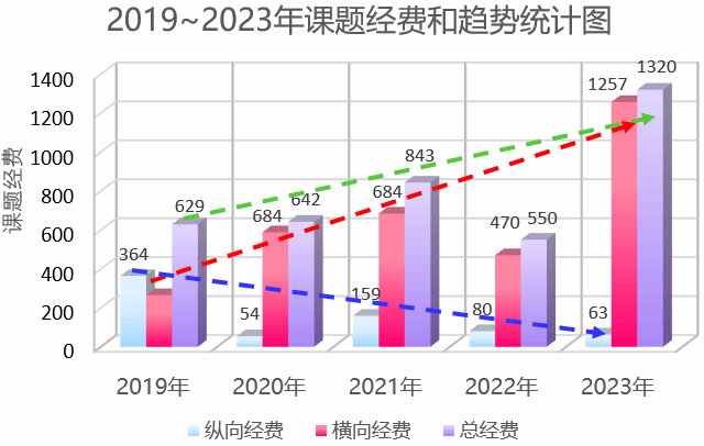 独播库 2019-2023年期间,共获批纵向、横向项目88项,经费总额度3984万元。其中纵向项目获批总数为44项、获批经费为720万元,横向项目获批总数为44项、获批经费为3264万元。在纵向项目中,独播库 于2019年获批国家自然基金面上项目1项,2020年获批国家自然基金青年项目1项,平均每年获批省部级项目8项,获批数量和获批经费额度稳中有升。横向项目平均每年获批8项,经费额度逐年大幅提升,特别是2023年获批横向项目经费1257万,位居全校前列。反映出独播库 教师科研水平不断提升,项目类型以科学研究型为基础同时向社会服务型迈进。