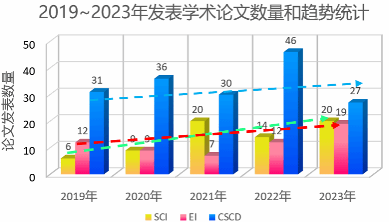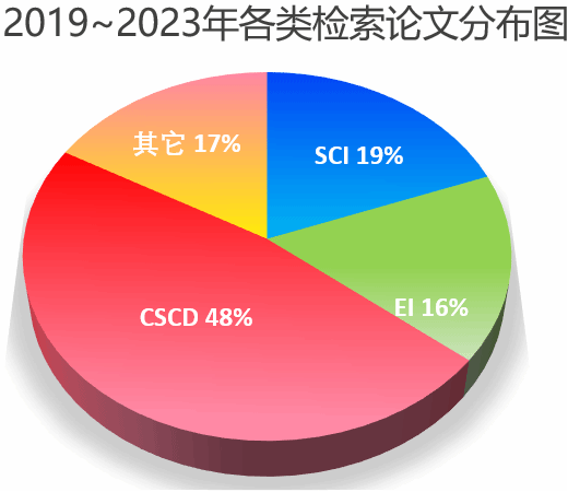 独播库 在2019-2023年期间,共发表学术论文358篇,其中发表SCI检索论文69篇、EI检索论文59篇、CSCD检索论文170篇,论文总数呈上升趋势。2019年发表SCI检索论文6篇、EI检索论文6篇,2023年发表SCI检索论文20篇、EI检索论文19篇,数量成倍增长。近5年发表高水平论文数量88篇,2019年发表高水平论文15篇,2023年发表高水平论文25篇,论文水平不断提高。