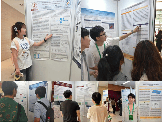 会议期间,公浩然,范丽聪,李明龙,姜瀚词、李柯5位同学分别将已录用论文《Efficient Ultra-wideband Balanced Power Amplifier Design for 0.7~2.5Ghz Based on ECCB/J Mode》、《An Optically Transparent Near-Field Focusing Metasurface Supporting Wide-Angle Incidence》、《High-power and high-efficiency power amplifier design based on composite load matching》、《Low Loss Triple Trap Ultra Wideband Filters》、《Dual-trap ultra-wideband filter using bow-tie T-resonator》以海报张贴的方式在会场中进行宣讲并与各高校同行进行深入的探讨交流。通过与清华大学、西安电子科技大学、东南大学以及北京邮电大学的数十名博士和硕士研究生的交流中发现,当前微波领域的发展大致朝着三个方向发展,即电子材料、智能化、集成系统化等三大方向。以交流为桥,以创新为帆,本次学术活动的圆满举办,不仅让师生们近距离触摸到微波领域电子材料、智能化、集成系统化三大方向的发展脉搏,更在思想交融中凝聚起推动技术革新的共识。