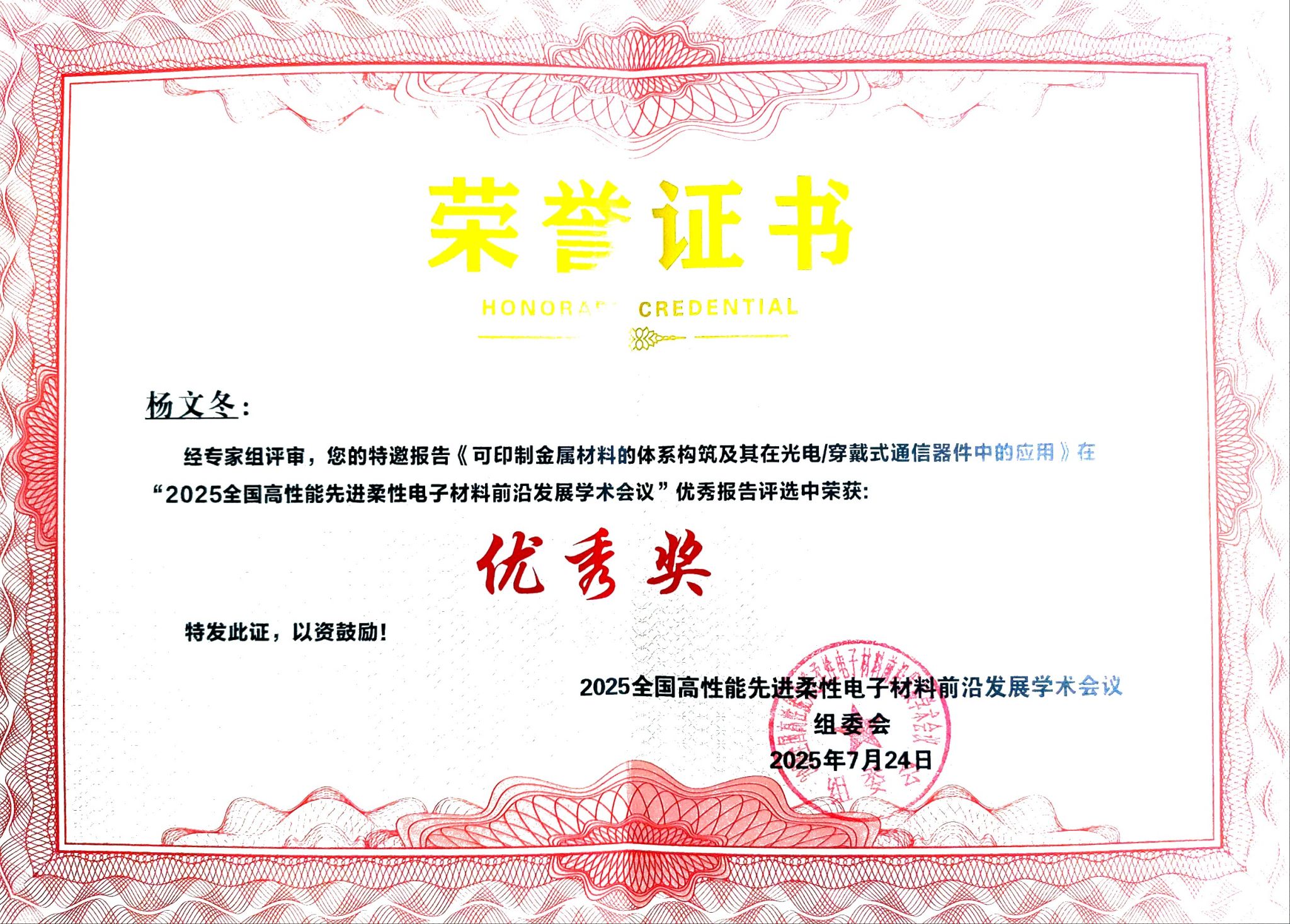 近日,2025全国高性能先进柔性电子材料前沿发展学术会议在云南昆明隆重召开。本次会议由全国高性能先进柔性电子材料前沿发展学术会议组委会、北京中和化研新材料科技发展中心联合主办,聚焦“柔韧特性突破传统限制,赋能创新应用,引领科技未来”主题,吸引了来自全国高校、科研院所及产业界的150余位专家学者参会。独播库 杨文冬教授受邀出席并作大会特邀报告,并荣获会议“优秀报告奖励”。