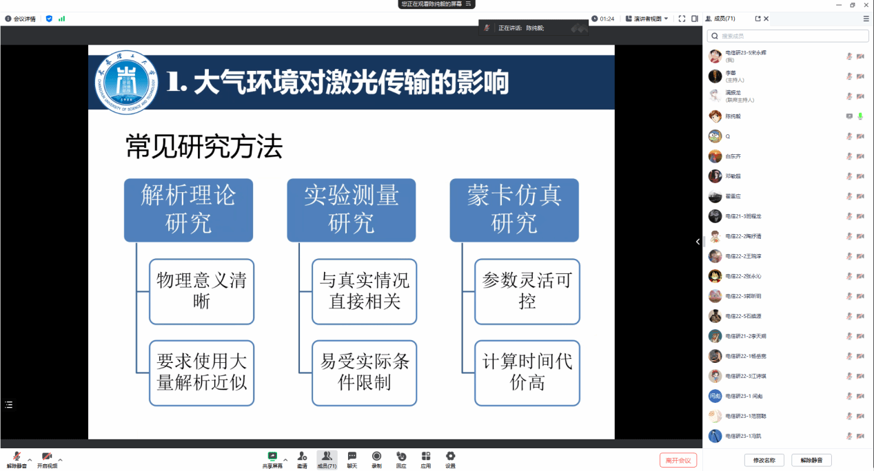 接着,陈教授深入探讨了数据处理与解析之道。他与师生们分享了模拟结果的统计解析与可视化方法,以及如何依据仿真数据评估光在大气中的传输效能;探索了仿真结果在实际应用中的潜力,为光通信系统设计、气象探测和目标识别等问题提供了宝贵的见解。在提问环节,他热心回答疑问,无私分享经验,引发了热烈的讨论。