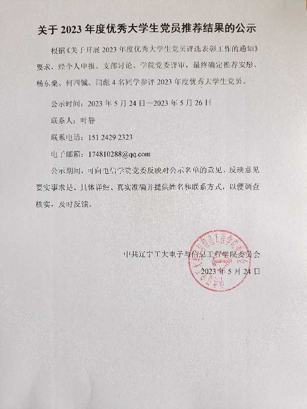 根据《关于开展2023年度优秀大学生党员评选表彰工作的通知》要求,经个人申报、支部讨论、学院党委评审,最终确定推荐安彤、杨东燊、何四铖、闫彪4名同学参评2023年度优秀大学生党员。