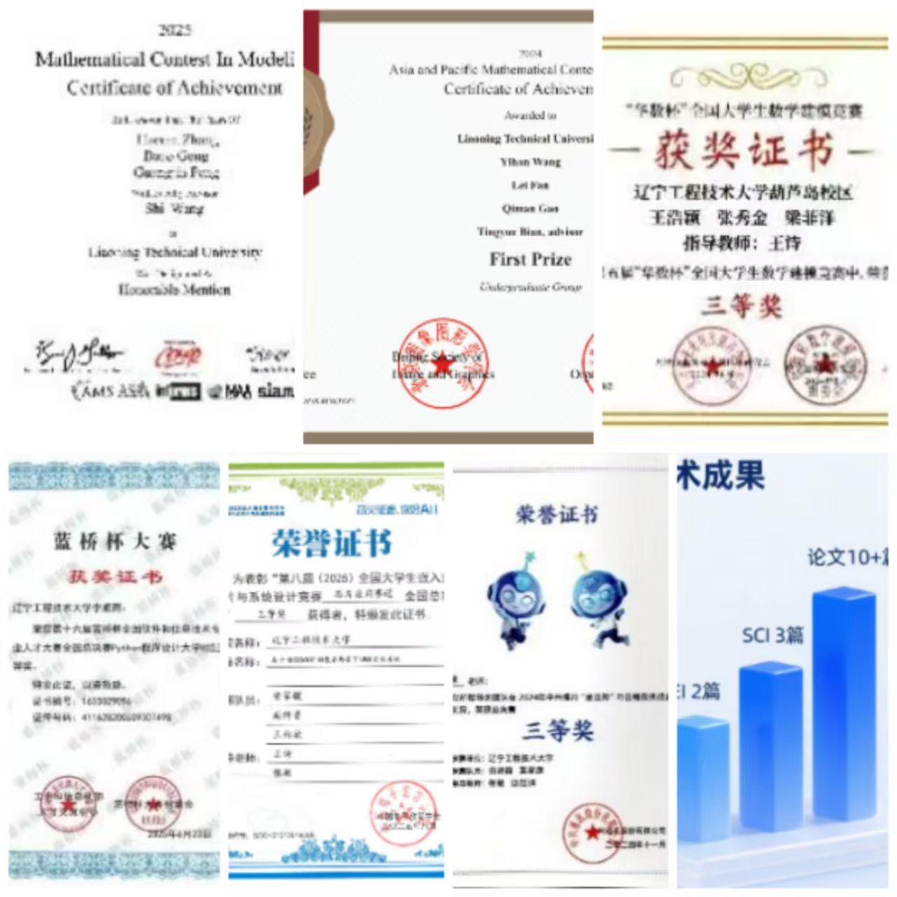 在数学建模领域2025年美国大学生数学建模竞赛获H2项2024年全国大学生数学建模竞赛获辽宁省一等奖2项、省二等奖1项、省三等奖1项,第五届“华数杯”全国大学生数学建模竞赛获国家二等奖1项、国家三等奖1项2024年第十四届APMCM亚太地区大学生数学建模竞赛国家级一等奖2项、国家二等奖1项、国家三等奖1项。