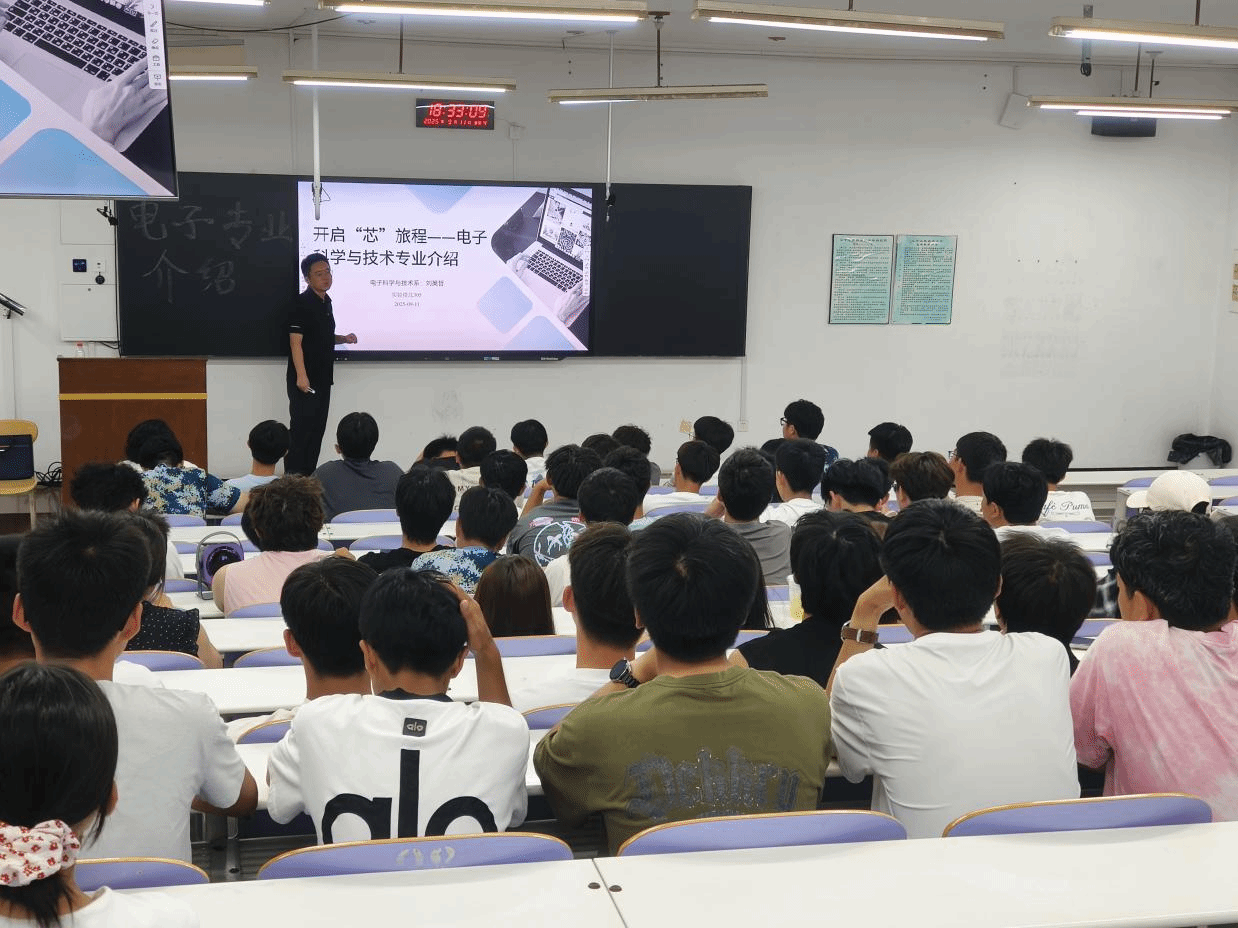 刘老师强调,电子科学与技术是串联多领域创新、驱动产业变革的“技术纽带”与“核心引擎”,渗透于通信、芯片、智能设备、物联网等诸多方向,既支撑前沿技术突破,也推动实体经济智能化升级,是驱动时代发展的重要力量。此外,刘英哲老师还给新生提出一些大学生活的建议,如要树立明确目标,积累实践经验,在课业之余学会自我管理并提高自身素养。并指出大一可初步探索职业方向,通过讲座、实习信息了解行业,为后续考证、实习做铺垫