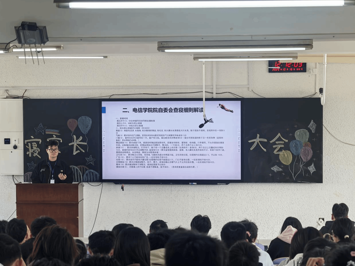 自委会主席张珈硕详细解读查寝细则,针对评分标准、检查流程等关键内容进行具象化说明,同时重点梳理查寝中常见的问题隐患,并明确未来寝室工作的重点推进方向,让各班生活委员及寝室长对管理要求有更直观的认知。