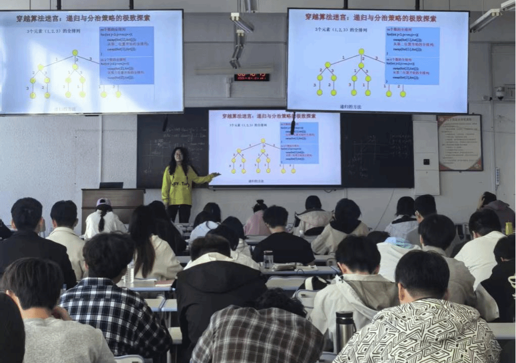 讲座期间,主讲教师围绕递归算法设计与优化、分治策略的核心思想以及递归与分治在科研中的应用等内容展开详细讲解,不仅介绍了相关理论知识,还通过斐波那契数列、快速排序、归并排序等诸多案例,直观展示其应用与性能差异,更分享了科研项目中的实例。讲座现场学习氛围浓厚,同学们认真聆听并积极思考。