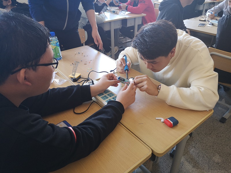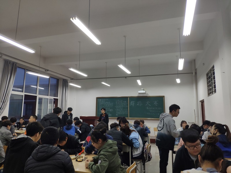 比赛开始前,先由指导人员为同学们讲解比赛时的注意事项以及焊接的技巧和相关事宜。由同学们以小组协同合作的方式完成本次焊接,焊接过程中,小组内人员一同合作,每个人都可以尝试焊接。焊接完成后,由指导人员负责检查其电路是否完好以及功能的实现情况。如若功能不能完全实现,同学们会根据指导人员给出的建议进行修改,修改后进行再一次的测试。焊接完成者会把本小组人员的姓名、班级和学号写在说明书后面,封好包装后由团委相关负责人员计时并妥善分类保管。