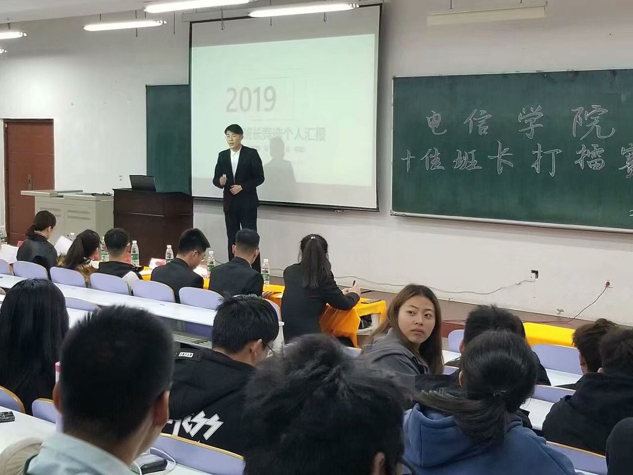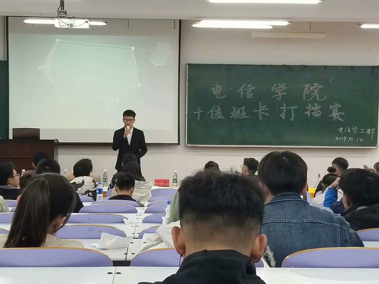 本次十佳班长的打擂赛共有四位班长参加。首先是来自电子16-1的班长李政,他分享了班级管理的一些经验和方法;来自计算17-5班的鲁蕴萱在介绍过班级和个人荣誉之后,重点讲述了“班级一对一帮扶学习小组制学习”的管理方法;电子17-2班的班长张权在老师多次提问关于学习和班级管理方面的问题都能流利作答,对于班级的四级通过率不高的问题,张权表示他已经针对此制定了详细的计划;最后发言的是来自计算16-3班的张铭楊,作为一群有理想有目标肯奋斗的青年,他们班级30人中有24人都选择了考研,通过开班会的形式,帮助同学找到未来奋斗的方向。
