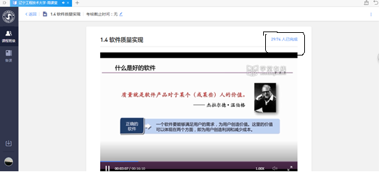 《软件工程》这门课程采用线上视频共享课的教学方式和QQ答疑的方式,软件采用学堂云,由于规定上课时间比较卡顿,故采用学生在规定的时间内自由学习。第一次需要学习完成的教学内容,必须在第二次课上课之前完成。用学堂云软件进行统计。还有存在网络资源短缺学生一名,采用传输教案和QQ答疑的方式进行,并要求学生返校后学习相关视频。