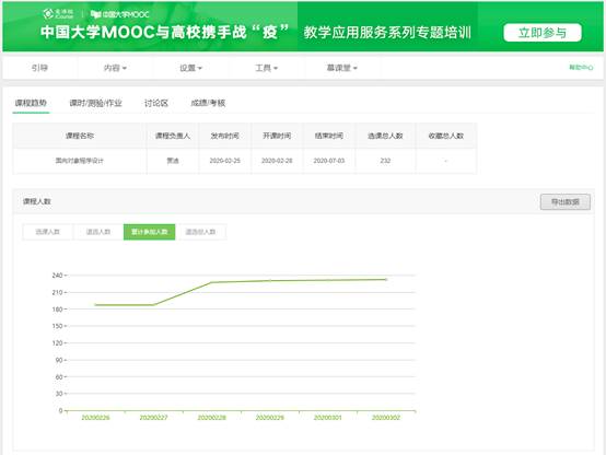 采用“中国大学MOOC+锋云智慧直播平台”的方式进行了一次课前辅导和一次慕课,课前辅导采用直播的形式给学生讲解了学习面向对象程序设计课程需要注意的事项,包括开发工具的下载、安装,编程过程中的初步调试方法等,使同学们在线上学习前能够对所学内容有一个总体了解,布置了周2的学习内容,学生普遍反映该该平台功能及授课方式较好。到目前为止(15:08)从后台数据中可见,大部分同学已经使用该功能完成了课程学习,有些同学视频观看2-3遍,还有少部分同学未进行课程的学习,晚些时候再次进行督促,拟定于本周3晚8:00通过锋云智慧直播平台对同学进行直播辅导。