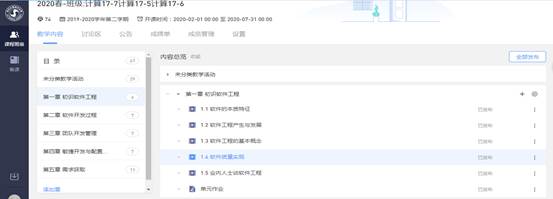 1.《软件工程》选择学堂云平台的视频课程,该课程内容与我们的教学计划基本一致,但是,仔细研究该视频课程内容及资料发现,内容深度和本学期的深度相当,但缺乏软件文档书写部分内容,可在线下课程中给学生予以讲解,加深学生的理解;