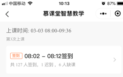 1、第一周周二第一大节为本学期第一次课,课程利用中国大学MMOC平台的慕课堂对学生进行上课情况管理,7:55邀请学生进入慕课堂,8:02开始签到(由网络原因,8点时无法提交申请)。共133名同学,其中1名同学因家中无网络无法学习,其他同学127人完成签到,1人迟到,5人未签到。由结果看同学基本能按时完成签到任务,在规定的时间内进行学习,也因为第一次上课,所以几名同学由于手机等原因没有完成,之后也与教师进行了沟通。