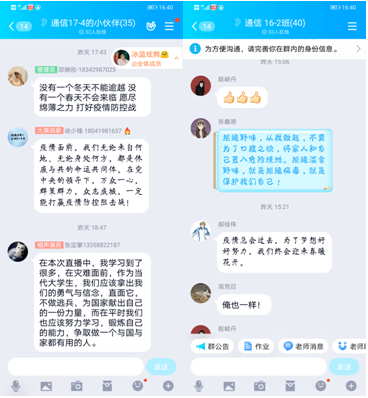 除个别同学家中网络不便以及与线上课堂时间冲突以外,绝大部分同学都及时观看了思政大课,因其他原因未能及时观看的同学,也都在其他时间观看了回放。各班还以班级为单位通过微信、QQ群、钉钉等形式多样的在线讨论形式,深化了对课程内容的认识和理解。