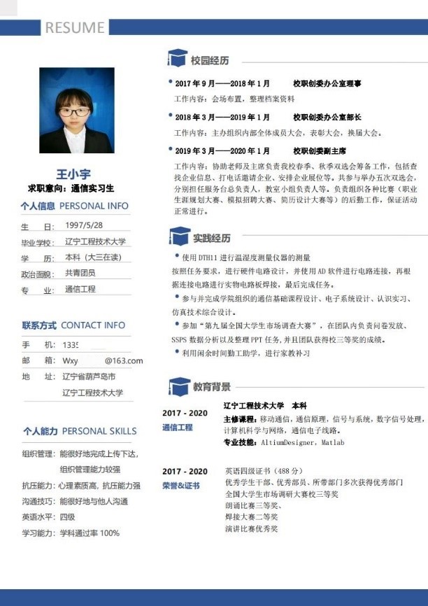 职创委于2020年5月26日至6月20日举办第七届求职简历设计大赛,本次大赛由电信职创委企划部承办,17级全体学生以及部分其他年级学生参加。