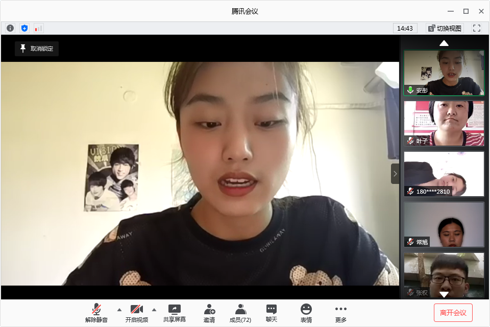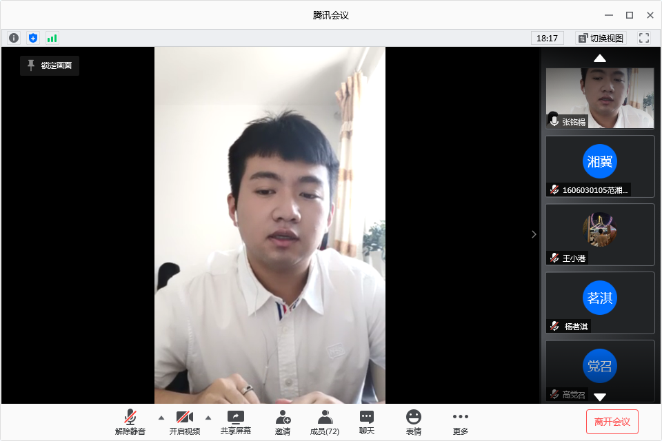 讲党史、讲抗疫先进人物事迹为此次云主题党日活动的第一部分内容。党员代表张玉瑶带领全体党员回顾建党历史,讴歌新中国以来取得的伟大历史成就;党员代表张权分享了抗击新冠肺炎疫情的英雄事迹,讲述党在抗疫过程中突显出来的先进性。云宣誓是此次党日活动的第二部分内容。全体党员在支部委员张洁的带领下,重温入党誓词。接下来支部2017级党员代表为毕业生党员送上临别寄语,字字句句表达了对未来的祝福和接过支部建设重任的决心。学生第一党支部书记张铭楊代表毕业生党员讲话,总结了自己在党组织中得到的锻炼和成长过程,嘱托2017级党员要更加努力工作,进一步发挥党员模范带头作用,推动党支部工作再上一个台阶。最后,学院组织员兼学生第二党支部书记叶静老师对此次活动总结发言。叶老师指出我们党员自南湖红船启航,历经99载风雨洗礼,一代又一代中国共产党人前赴后继,以舍我其谁的使命担当和力挽狂澜的豪迈气魄,用鲜血和生命挺起了中华民族的坚强脊梁,实现了中国人民从站起来到富起来再到强起来的伟大飞跃,带领全国人民朝着实现中华民族伟大复兴的中国梦阔步前行!希望所有毕业生党员无论未来身在何处都要“不忘初心,牢记使命”,充分发挥先锋模范作用,立足新起点,瞄准新目标,勇担新使命,为社会主义事业奋斗终生。