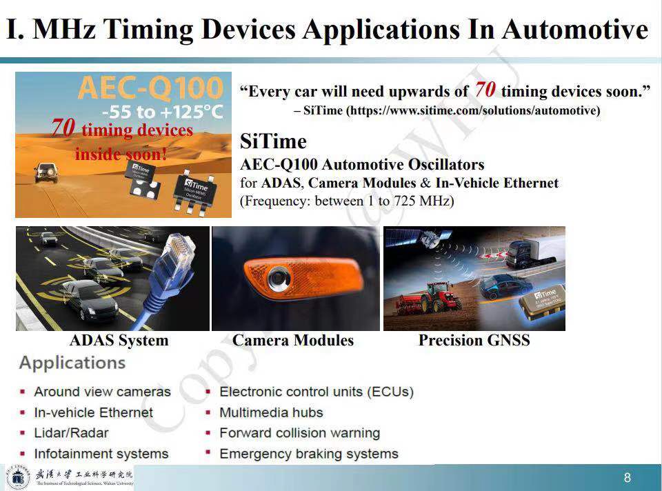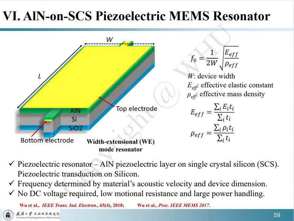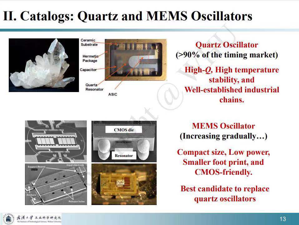 吴国强博士自西安电子科技大学毕业后在中科院上海微系统所攻读博士学位,后在中航工业自控制所任工程师。2014年到2018年在新加坡科技局微电子研究院任研究,现任职于武汉大学工业科学研究院教授,博士生导师,一直致力于MEMS/NEMS传感器与智能微系统的研究。相关报告分为谐振器基本原理、压电材料特性、市场前景、商品化关键技术及AIN-on-Si MEMS谐振器及振荡器六个部分。详细介绍了谐振器的发展历程、商业化现状、用于电路时钟的振荡器解决方案,内容涉及驱动器原理、动态特性模拟、时钟噪声控制、材料选择及集成工艺制造等问题。MEMS(Micro-Electro-Mechanical System)即微型机电系统,指大小在毫米级以下,构成元件尺寸在微米、纳米量级的可控制、可运动的微型机电装置。近年来随着MEMS技术的发展,微机械谐振器得到迅速发展,作为时间和频率的基准,谐振器是构成振荡器、滤波器和混频器等电子系统的基本部件。按照制作材料可分为单晶硅谐振器、多晶硅谐振器、碳化硅谐振器、多晶锗化硅谐振器和金刚石谐振器等。其中,单晶硅体模态微机械谐振器的Q值高、谐振频率大。为实现高精度时钟,采用AlN压电材料形成可调弹膜,改善单晶硅微机械谐振器频率特性,获得理想的动态电容、动态电感,降低时钟噪声。