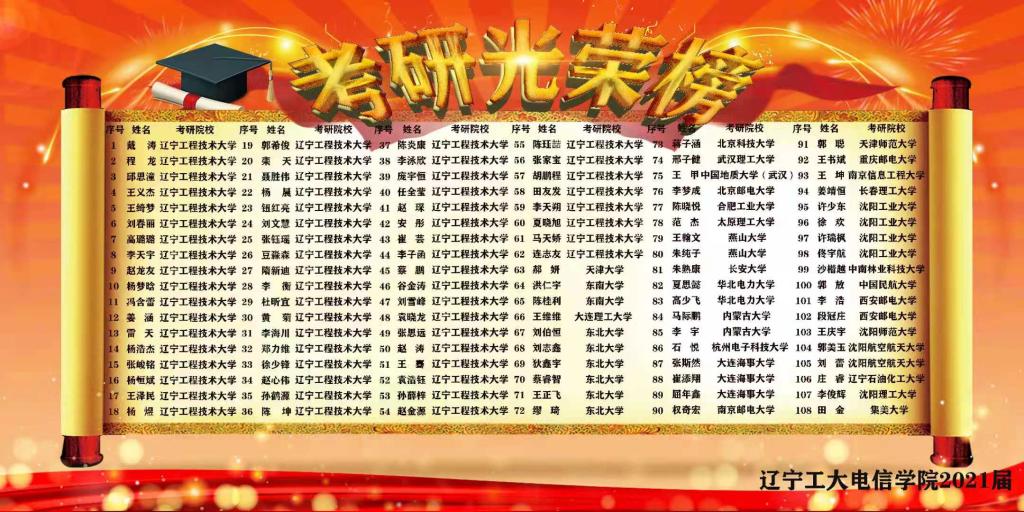 2021届学生考研工作成绩喜人,到目前为止共有108名学生成功考取研究生。通信17-4班考研录取率为41.9%,计算17-1班考研录取率为40.7%,通信17-1班考研录取率为36.7%,学院平均录取率为25.5%,其中10名学生被天津大学、东南大学、东北大学、大连理工大学大学等双一流大学录取,25名学生被北京科技大学、北京邮电大学、南京邮电大学、武汉理工大学等一流学科建设高校录取。