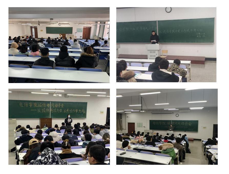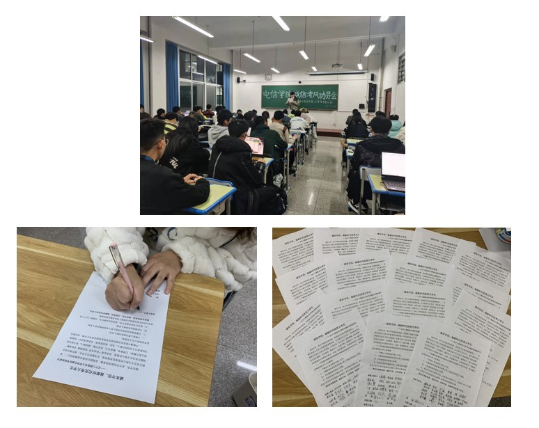 诚信考试承诺书》。各班级组织同学在班会上大声朗读承诺书并进行了庄严的宣誓。全体同学在承诺书上亲笔写下自己的姓名,并郑重地将承诺书上交。每一张薄薄的承诺书都承载着电信学子诚信应考、诚信做人的决心。