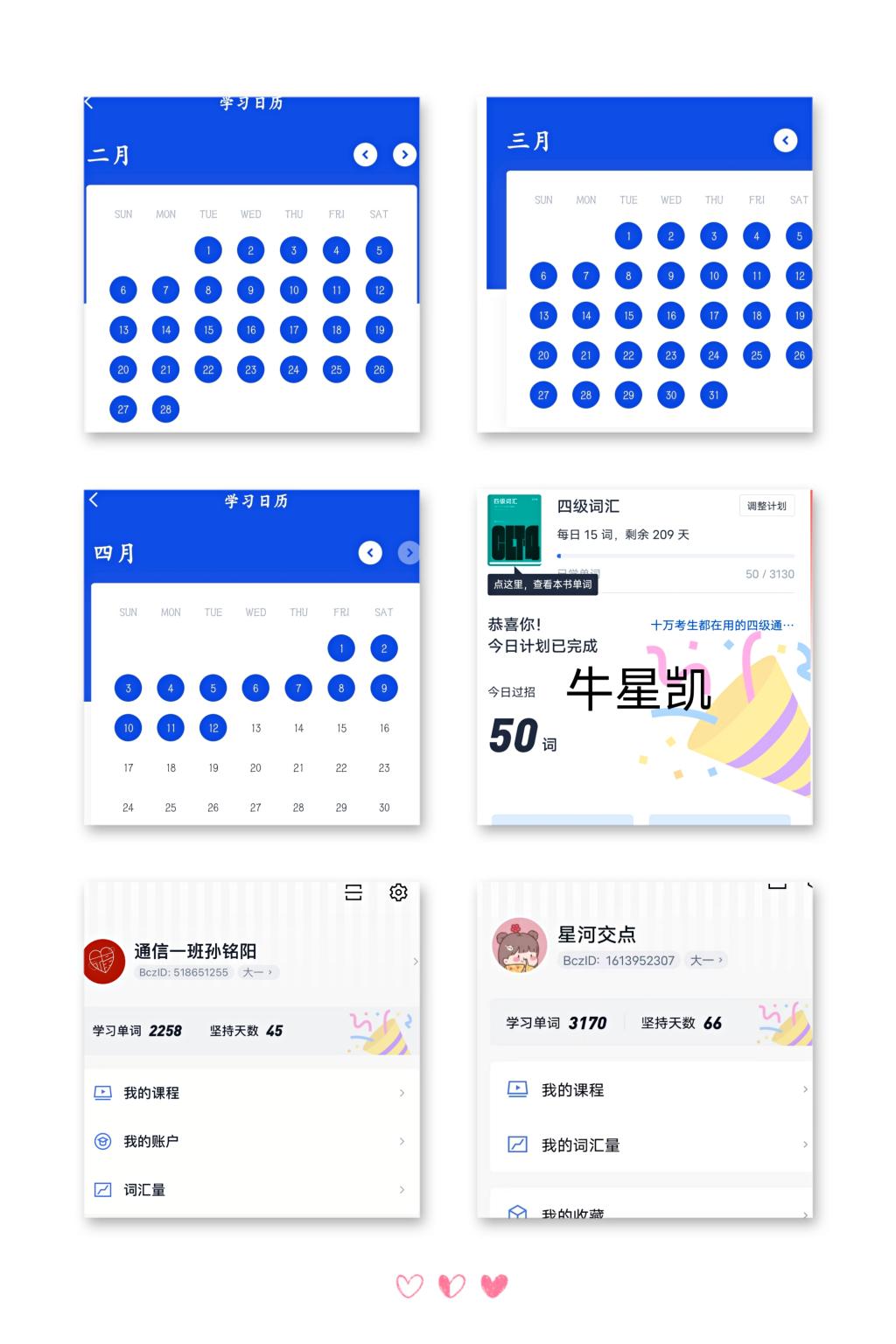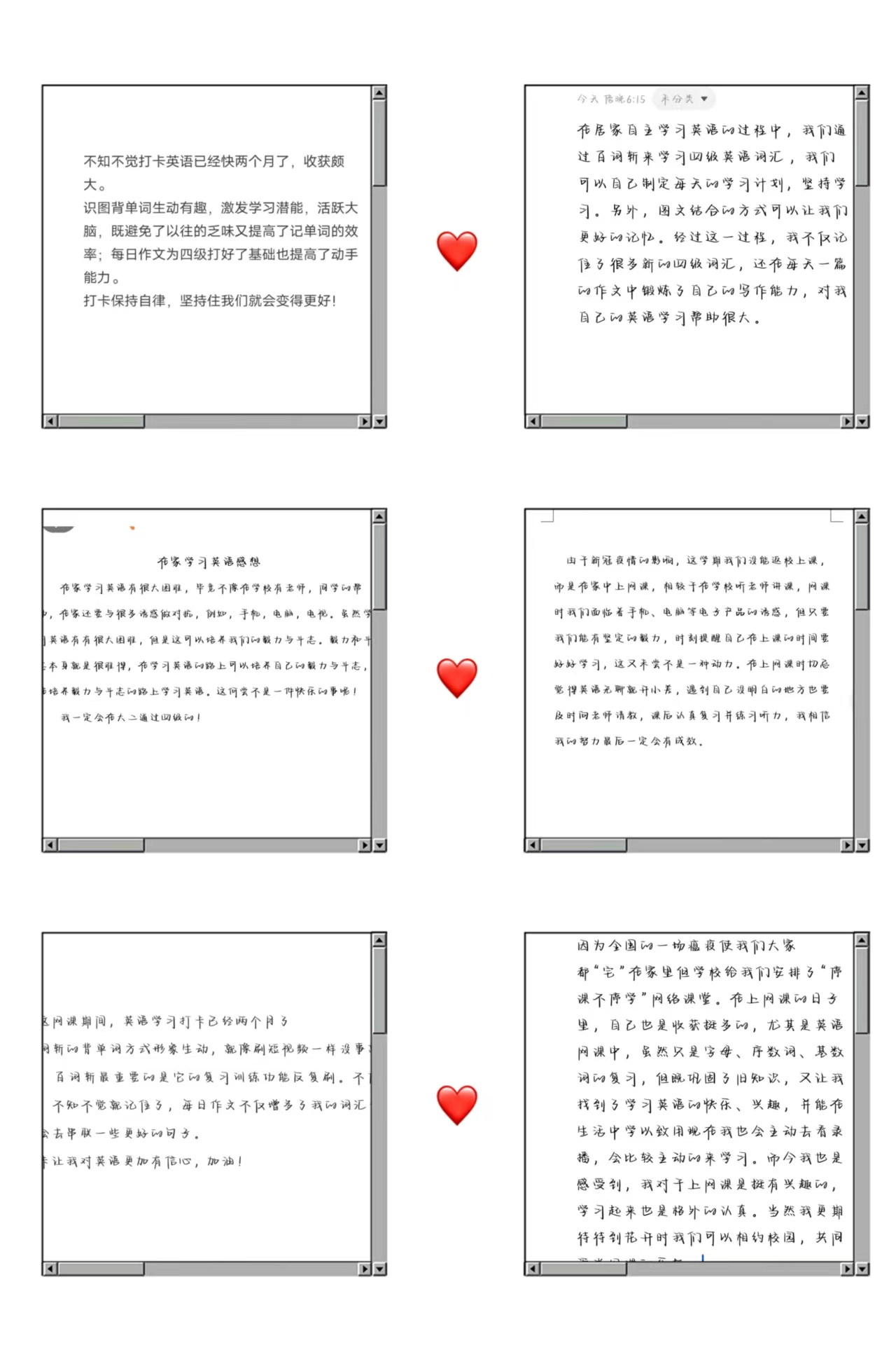电信21-1冯淼同学通过这段时间的学习,体会到:“识图背单词生动有趣,激发学习潜能,活跃大脑,提高了记单词的效率”;通信21-2郭林同学觉得:“每日作文为四级打好了基础也提高了动手能力”;计算21-5祁瑞莱同学说:“每日打卡使我们养成了一个良好的习惯”;通信21-1孙志斌同学认为:“活动历时长锻炼了我们持之以恒,坚持不懈的品行”。