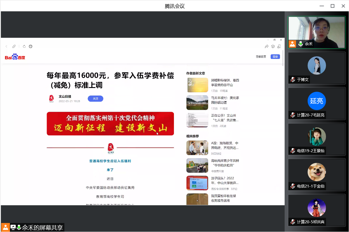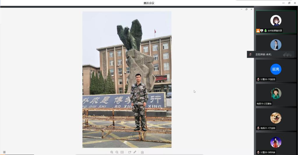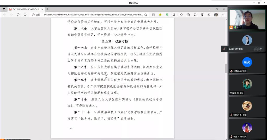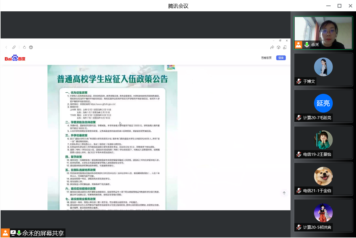 组织召开了大学生征兵宣传教育及入伍动员线上会议,各班级负责征兵宣传的学生骨干、寝室长和有入伍意向的同学共近百人全程听会,会议由学院学工部主任马颖哲老师主持。