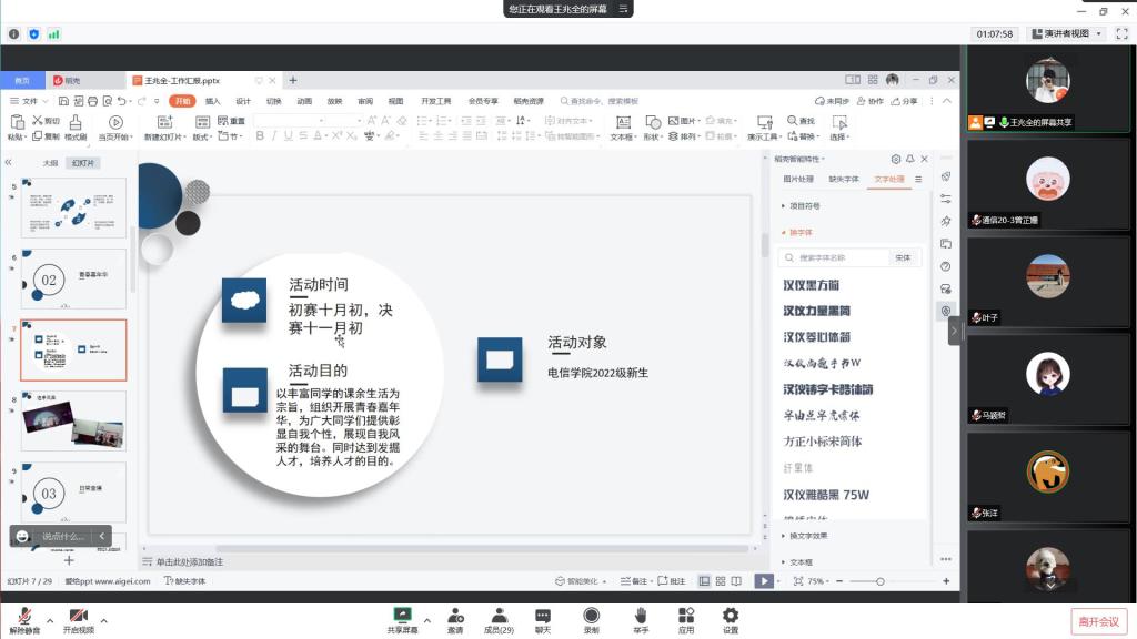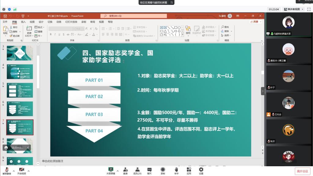 辅导员张洋老师、吴汇辞老师、马颖哲老师、王兆全老师分别以PPT的方式向各位班导师和副班导师介绍了自己分管的各项工作和具体工作内容。