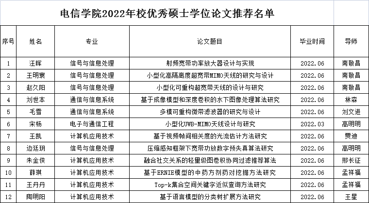 答辩委员会根据论文质量和答辩情况,在推荐比例不得超过评选时限内硕士毕业人数的15%要求下,最终推荐汪晖、王明寰、赵久阳、刘世本、毛雪、宋杨、王凯、边廷玥、朱金侠、薛琪、王丹丹、陶明阳等12名硕士毕业生撰写的学位论文参评校级优秀硕士学位论文。