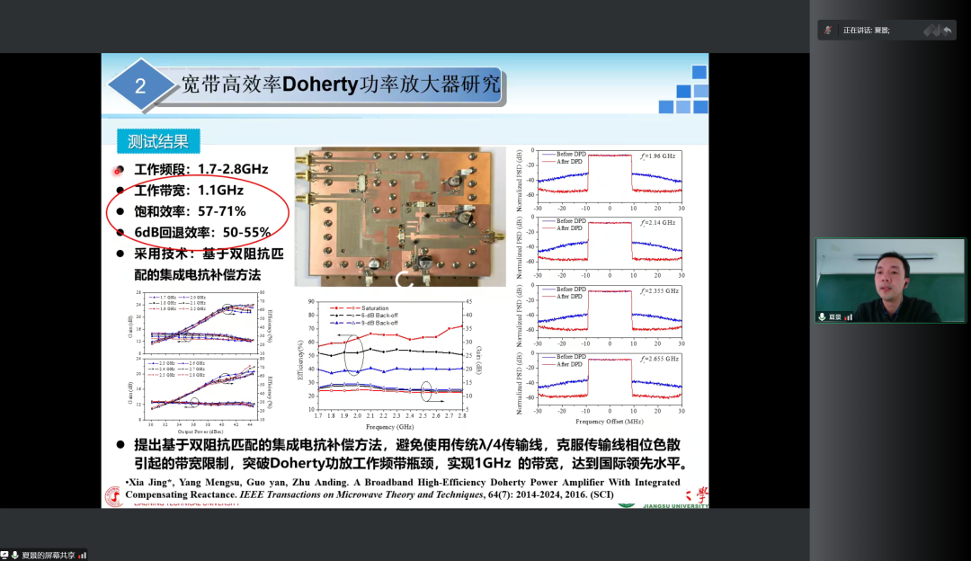 在本次讲座中,夏景教授讨论了宽带高效Doherty功放设计理论与方法、Doherty功放功率回退范围增强技术、同时双频Doherty功放理论等内容。针对未来通信系统要求进一步提升给功放设计带来的挑战,报告还介绍了基于多目标进步算法(MOEA)的非规则匹配功率放大器优化设计方法,以解决5G发射机中功放带宽和效率进一步提升的问题。最后,还交流了项目申报方面的经验,以及论文写作思路,使师生们对学术科研的发展方向有了更清晰的认识。