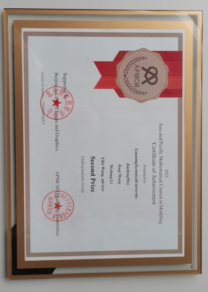 3.魏建锋、王嘉琦、李威珑团队荣获第十二届亚太地区大学生数学建模(APMCM)竞赛二等奖(指导老师:王艺扉)。
