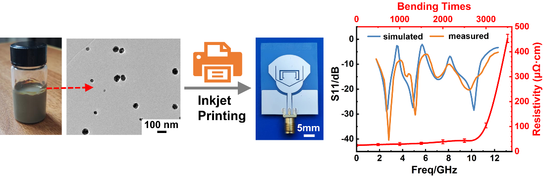 针对这两方面,我们从材料体系、增材制造和多功能天线设计三条技术的交叉和集成创新中尝试突破。ACS-ANM论文借助纳米银墨水材料和喷墨印刷技术,制作了一款所设计的具有三陷波特性的可弯曲超宽带天线,屏蔽了来自WiMAX、WLAN和X上行频段的干扰,且天线在弯曲后仍能保持良好的超宽带和三陷波性能。研究可为“低成本”和“高效制程“的柔性多功能天线的发展奠定研究基础。ACS-AEM论文利用混合二元羧酸银作前驱体,打造了一款性能可调的丙二酸银导电墨水。可为银基溶液型墨水提供简便且具有成本效益的性能调控方法。