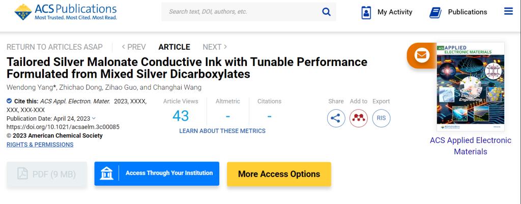 青年教师杨文冬教授团队在国际知名期刊ACS Applied Nano Materials和ACS Applied Electronic Materials分别发表了题为“Printable Silver Nano Ink for Bendable Ultra-Wideband Antenna with Triple-notch Characteristics”和“Tailored Silver Malonate Conductive Ink with Tunable Performance Formulated from Mixed Silver Dicarboxylates”的研究型论文。
