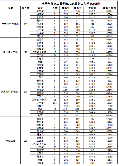 学院共开设四个专业,分别为电子信息工程、电子科学与技术、计算机科学与技术和通信工程。四个专业面向全国招生,在多数省份均有招生。本次在全面统计的基础上,重点对学院各专业2020-2024年招生主要省份(辽宁省,河北省和河南省)的招生数据进行了统计分析和展示,主要包括最高分、最低分、平均分、招生人数和最低分位次等指标。本次统计数据全部来自于内部招生数据,数据准确可靠。本文同时对近年来的生源质量的趋势进行分析和说明,最后给出2024年度学院各专业在各省招生数量,分数区间和位次。