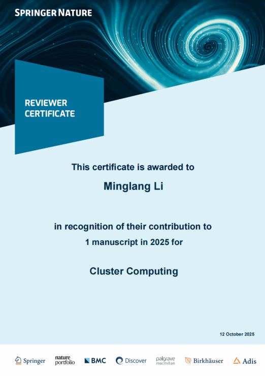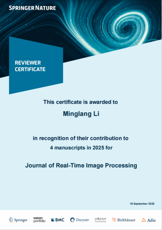 担任多个知名SCI期刊审稿人:Cluster Computing、Signal, Image and Video Processing、