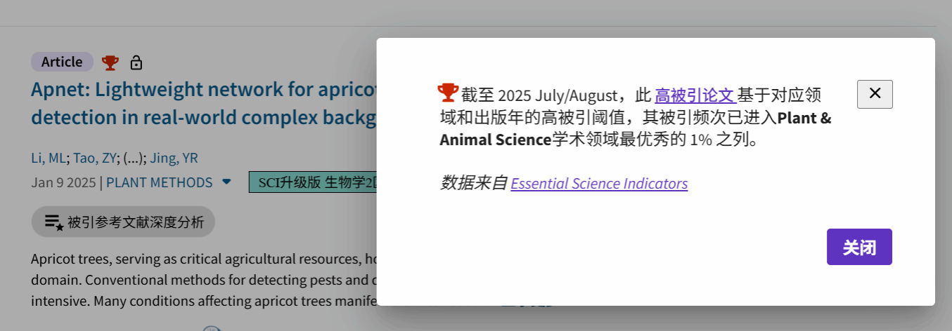 [1] Li M, Tao Z, Yan W, et al. Apnet: Lightweight network for apricot tree disease and pest detection in real-world complex backgrounds[J]. Plant Methods, 2025, 21(1): 4.