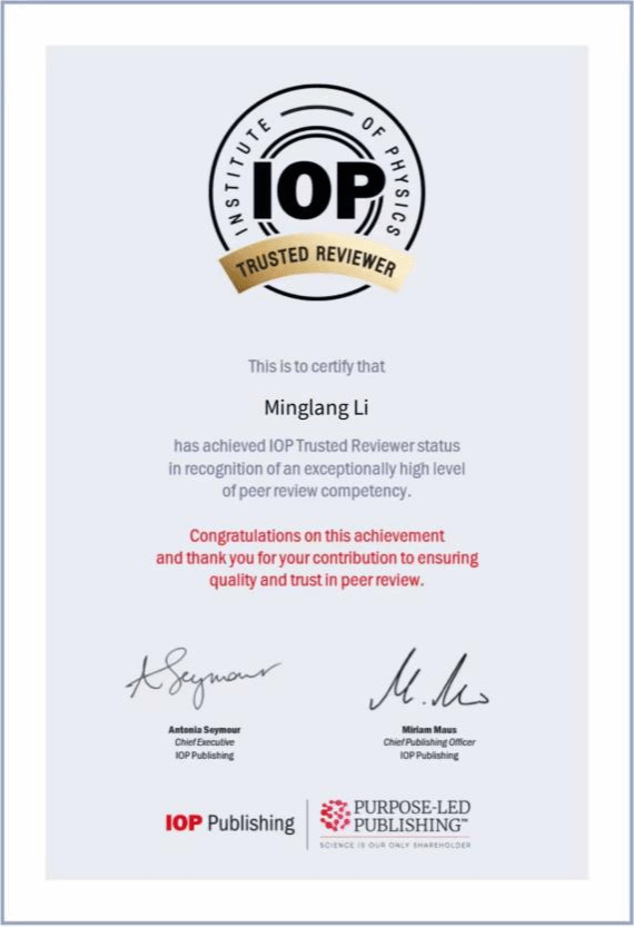 英国皇家物理学会(IOP) Trusted Reviewer证书
