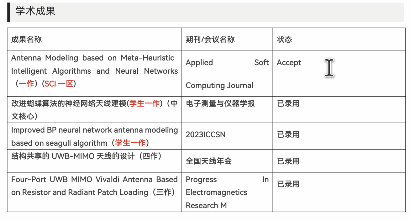 · 具体成果:在硕士期间,完成了利用神经网络对天线等前端器件进行优化,这些成果对于天线建模领域具有重要意义。