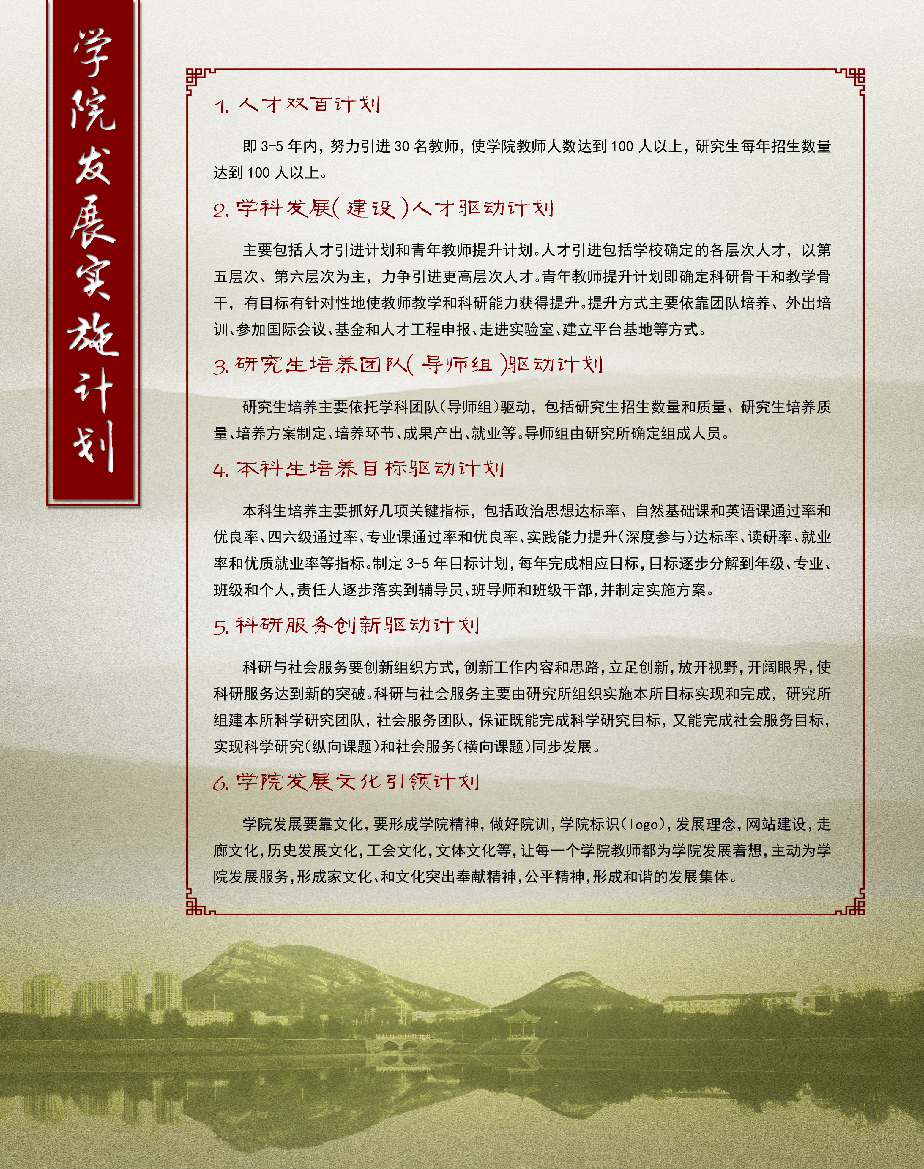 人才双百计划:即3-5年内,引进30名教师,使学院教师人数达到100人以上,研究生每年招生数量达到100人以上。