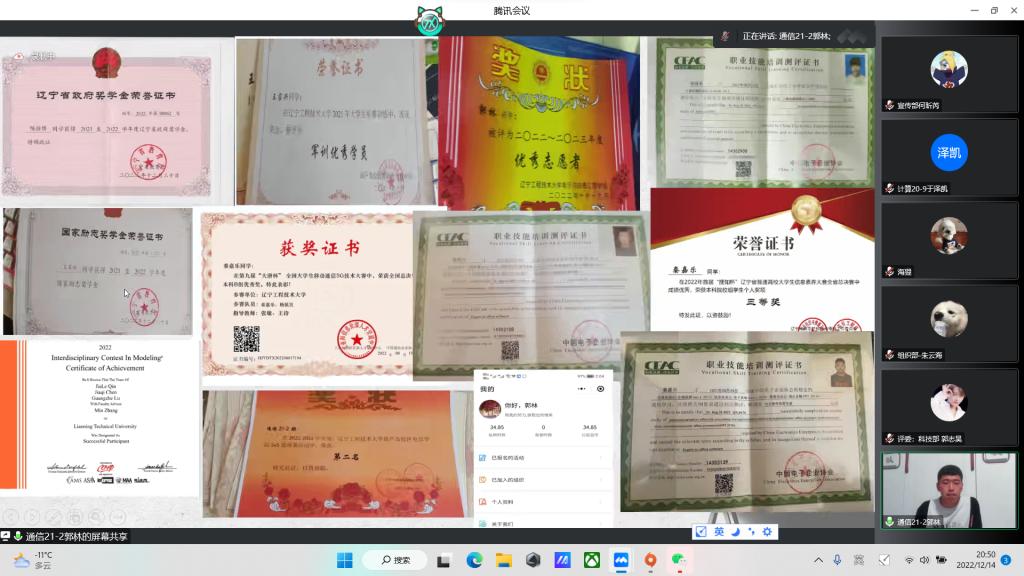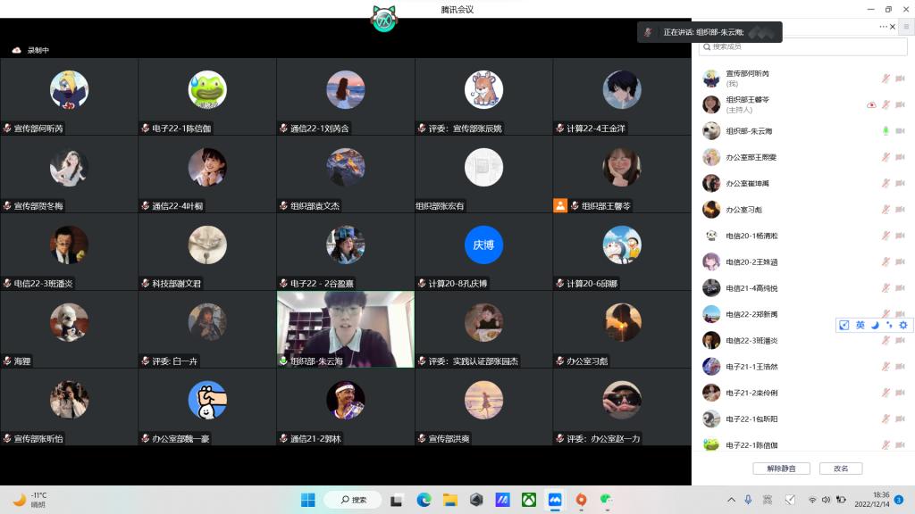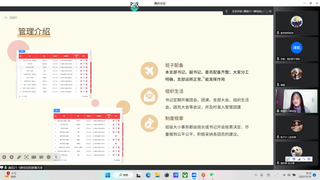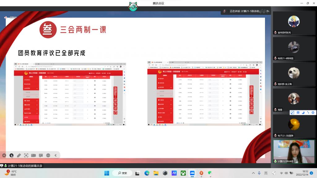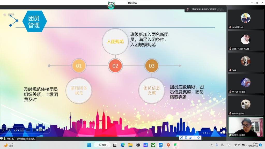 为规范运行基层团支部各项工作,更有效地联系青年、引导青年和服务青年,出色地完成团支部工作,2022年12月14日18:30电信院团委于线上举行2022年度团委对标定级复核暨团支书述职大会。院团委书记吴汇辞、团委副书记白一卉、各班团支书及团委各中心主任参加此次大会。