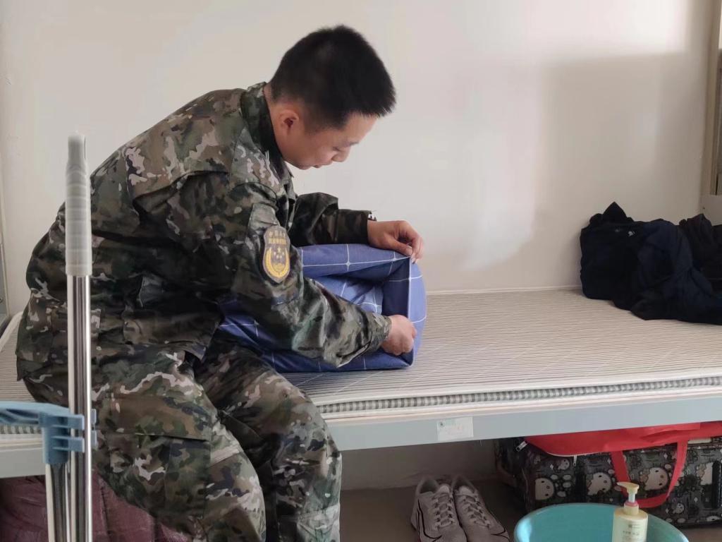 教官分别从寝室卫生、物品摆放、被褥整理等方面对新生寝室进行检查指导,向同学们指出不足之处并提出改进建议。教官们为同学们演示了叠好军被的几个步骤,一边示范一边讲解要领。一床蓬松的棉被在“叠、压、捋”几个动作之下,变成了四四方方的“豆腐块”