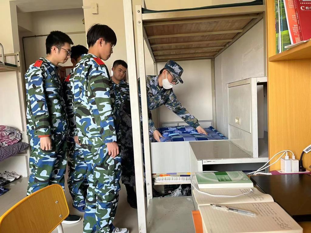 组织2022级新生学习内务整理,带训教师与教官、副班导师共同深入寝室指导新生进行内务整理。