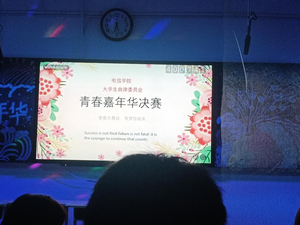 百余名师生齐聚一堂,活动在热烈的掌声中拉开序幕。在个别节目的开场前,通过Hi现场,随机抽取幸运观众,送出精美礼品,既点燃观众热情,又增强观众的参与感。 青春嘉年华活动,提倡广大青年参与到户外运动中,增强身体素质,彰显青春活力。让我们一起运动起来,展现当代青年学生朝气蓬勃的精神风貌吧!本届青春嘉年华的节目虽已落幕,但是电信学子闪耀的青春永不落幕,让我们期待明年四月第二十届的“青春嘉年华”活动!歌喉曼妙,舞姿优美,丝竹声声悦耳,武术虎虎生风,更有相声、小品轮番上阵。且邀诸君,一同观赏。十位选手加上自委全体部长精心准备,节目表演精彩纷呈。“青春嘉年华”给学生提供了一个施展才华、彰显个性、启迪梦想的平台,也为学校增添了更多的生机与活力。大家在院自委精心布置的会场中观赏节目,于各种道具所营造的氛围中舒缓神经,倾听悦耳的音乐,欣赏优美的舞姿,展现自身所长,丰富多彩生活。