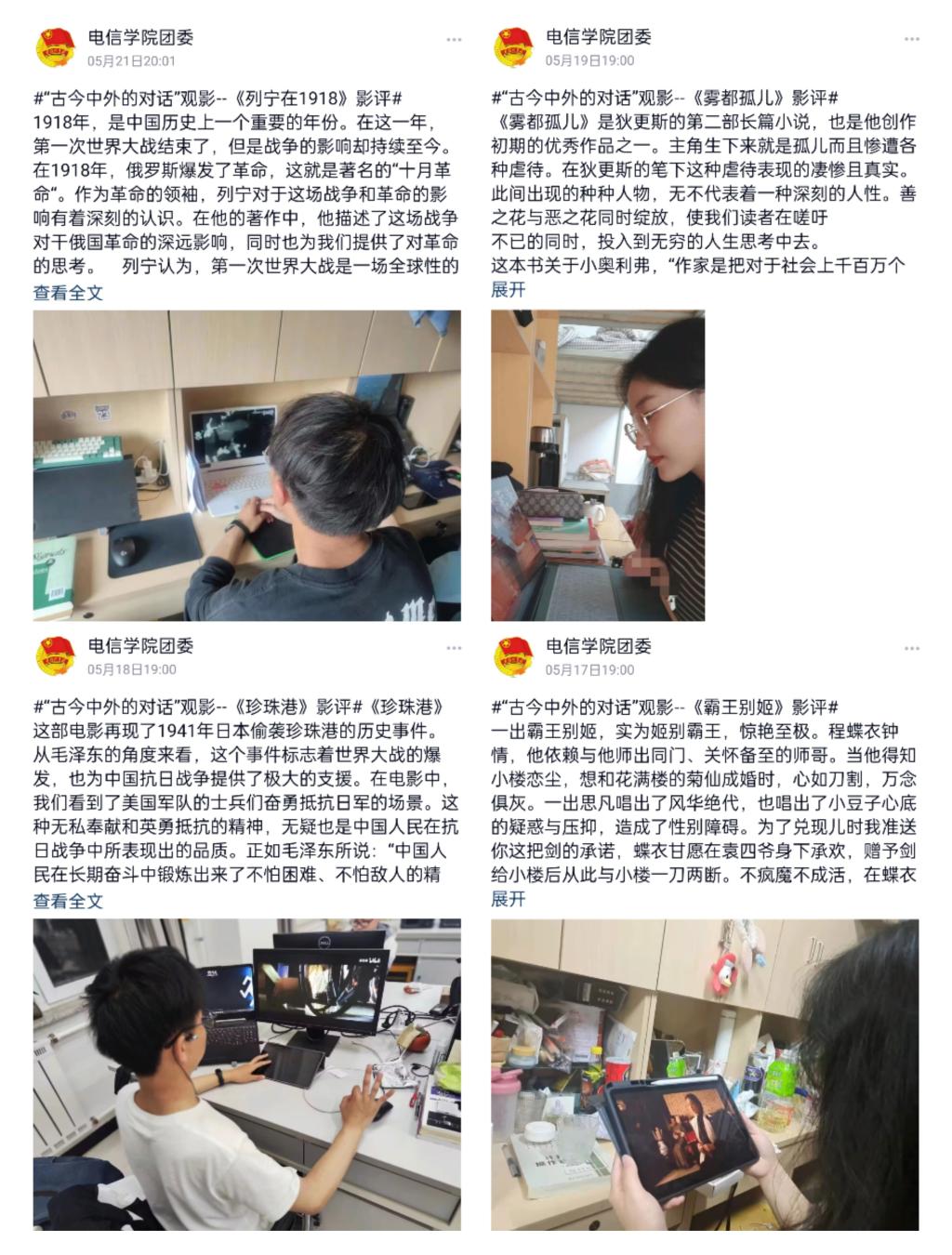 在各个支部自行观影后,院团委收集了优质影评,其中包含计算20-1班的赵佳琪同学分享的《霸王别姬》影评、电信20-2班的杨怀成同学分享的《珍珠港》影评、通信22-1的刘芮含同学分享的《雾都孤儿》影评、通信21-1李梁超同学分享的《列宁在1918》影评,以上作品均于5月17日到5月21日期间在全院进行了宣传和推广。