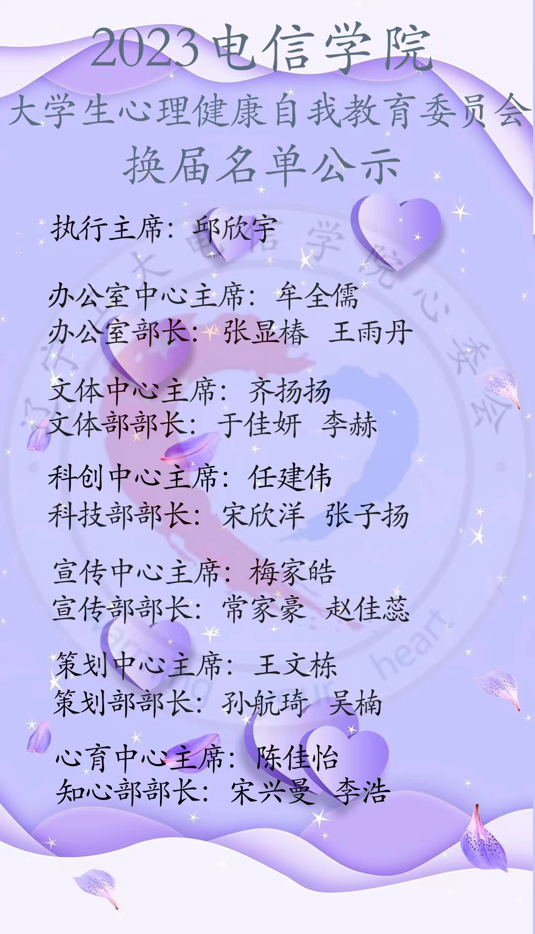 大学生心理健康自我教育委员会2022届心委会主席团成员一起出席了换届选举大会。在每位部长竞选发言后,投票选举出2023届心委会主席团成员,名单如下: