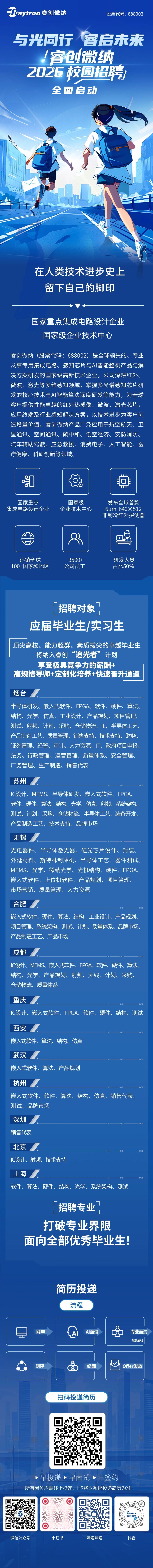 睿创微纳致力于打造中国最有价值的特种芯片企业,成为世界领先的智慧感知技术解决方案提供商,承载“让人们从更多维度发现世界之美”的使命,在持续拓展人类感知能力的征途上留下自己的脚印。