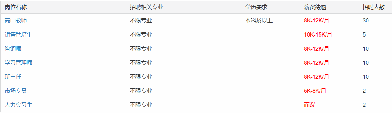 招聘岗位:数学、物理、化学、生物、英语、语文、政治、历史、地理。