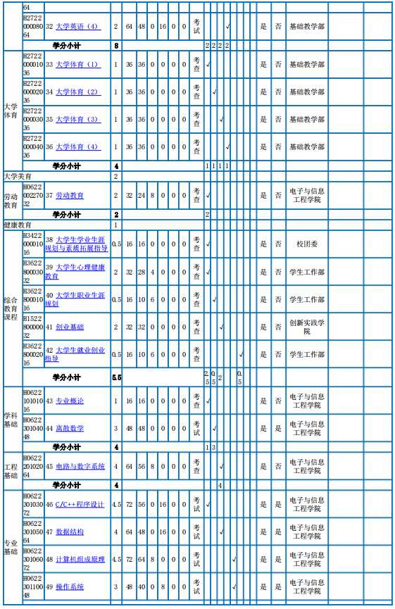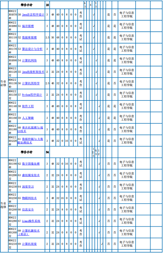 电路与数字系统、C/C++程序设计、数据结构、汇编语言与计算机组成原理、JAVA语言程序设计、编译原理、操作系统、计算机网络、数据库原理、Java高级框架技术、Python程序设计、人工智能、计算机图形学、算法设计与分析、单片机原理与接口技术、虚拟现实技术、数字图像处理、数据挖掘与大数据处理技术、深度学习基础、物联网技术、信息安全。