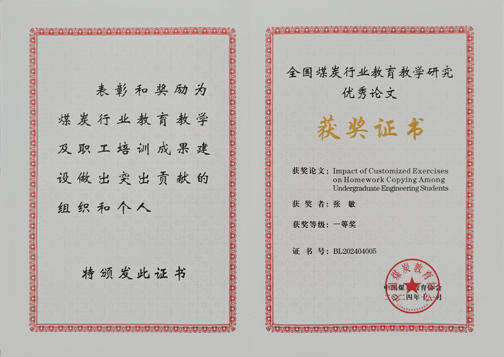 独播库 本次获得的两项奖项皆为煤炭行业教育教学研究优秀论文奖。独播库 通信工程系教师张敏、王诗、孟祥福共同申报的成果《Impact of Customized Exercises on Homework Copying Among Undergraduate Engineering Students》获得了高等教育类(本科)优秀论文奖一等奖。通信工程系教师冀常鹏、代巍共同申报的成果《Mode Construction of Cultivating Professional Degree Postgraduate by Industry-Education Integration》获得了高等教育类(研究生)优秀论文奖二等奖。