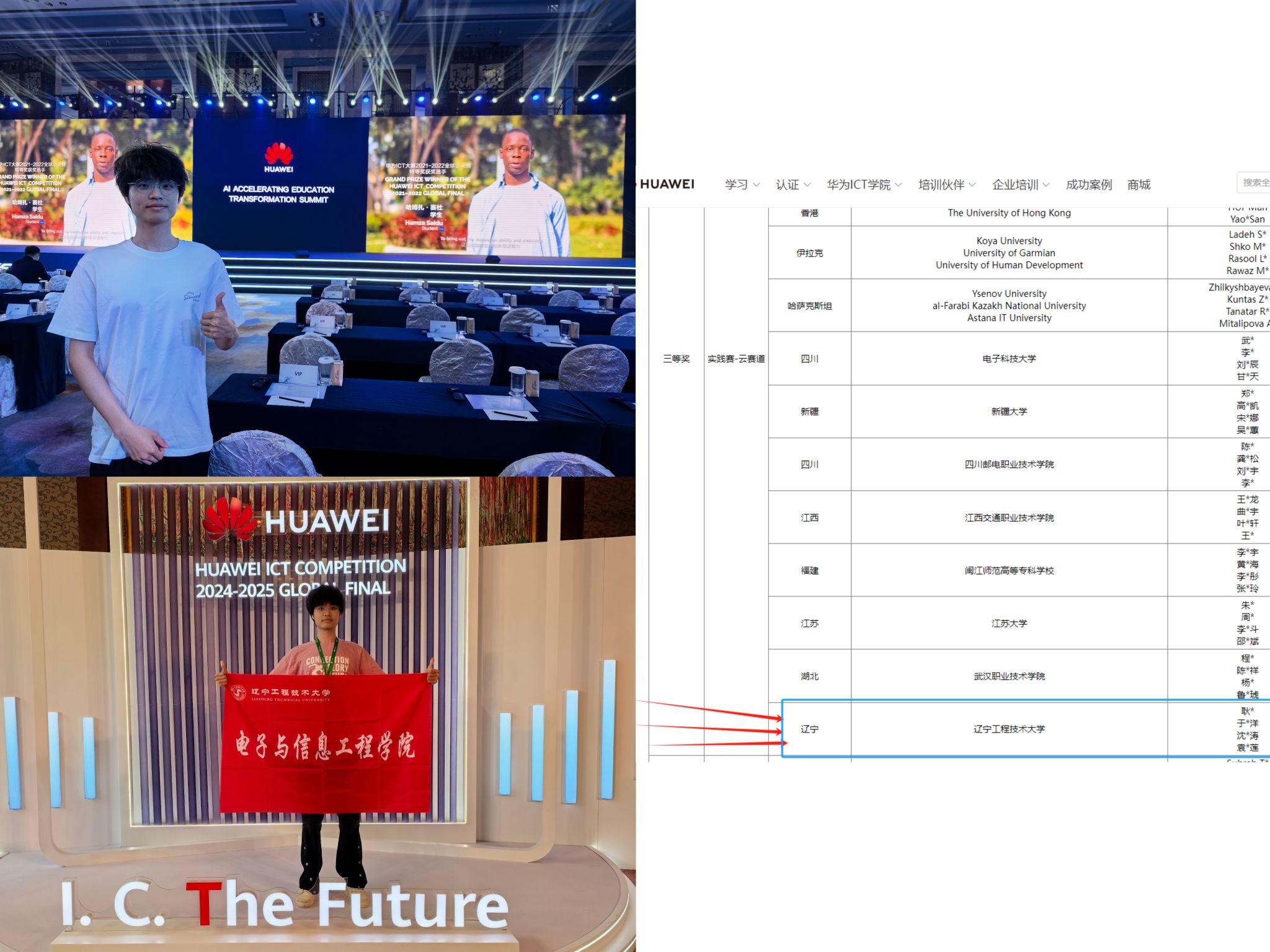 电子科学与技术专业学生沈俊涛与来自软件学院的两名同学于海洋、袁雪莲组队参赛,凭借扎实的ICT理论功底与实践能力,克服相关阻力,荣获云赛道全球三等奖(全部获奖名单参见://e.huawei.com/cn/talent/news/#/details?consultationId=4969)、国家一等奖,展现了我院ICT技术领域人才培养的学科优势和学生知识技能培养扎实的特点。